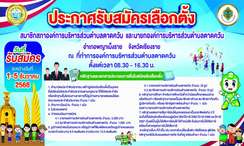 | 8 | (ประกาศรายชื่อผู้ชนะการเสนอราคา / ประกาศผู้ได้รับการคัดเลือก) จ้างจ้างเหมาประกอบอาหารกลางวัน ศูนย์พัฒนาเด็กเล็กองค์การ บริหารส่วนตำบลตาดควัน ประจำเดือน มกราคม 2569 โดยวิธีเฉพาะเจาะจง | คลิกอ่าน.. | 30/12/2568 |
