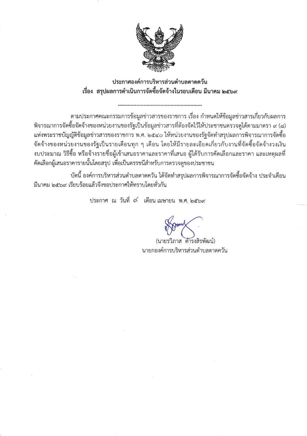 | 10 | (ประกาศรายชื่อผู้ชนะการเสนอราคา / ประกาศผู้ได้รับการคัดเลือก) จ้างดำเนินงานด้านธุรการ งานด้านการเงินขององค์การบริหารส่วนตำบลตาดควัน ประจำเดือน เมษายน - มิถุนายน ๒๕๖๙ โดยวิธีเฉพาะเจาะจง | คลิกอ่าน.. | 31/3/2569 |