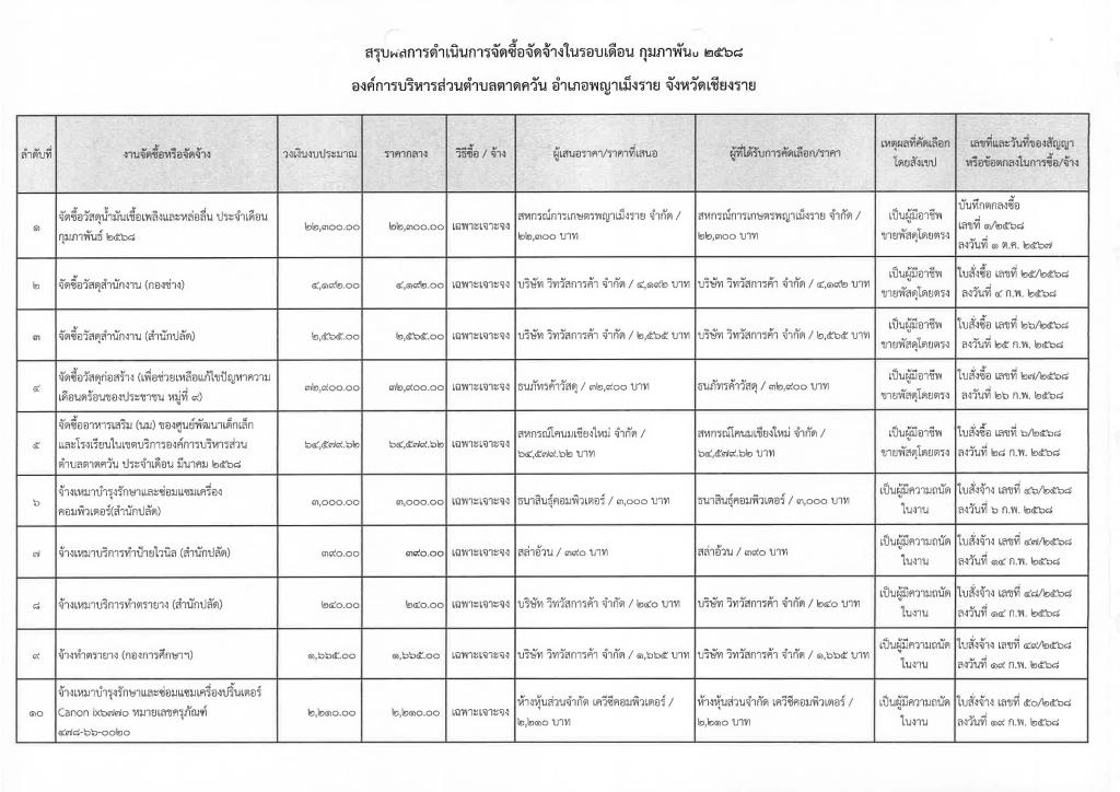รายงานสรุปผลการดำเนินการจัดซื้อจัดจ้าง ประจำเดือน กุมภาพันธ์ 2568
