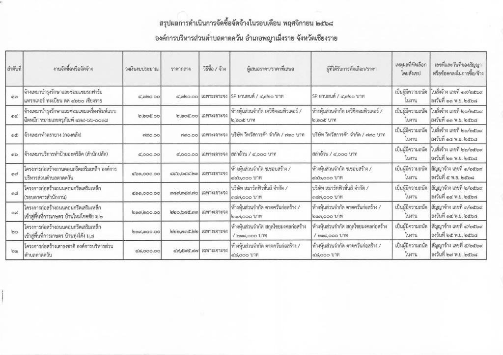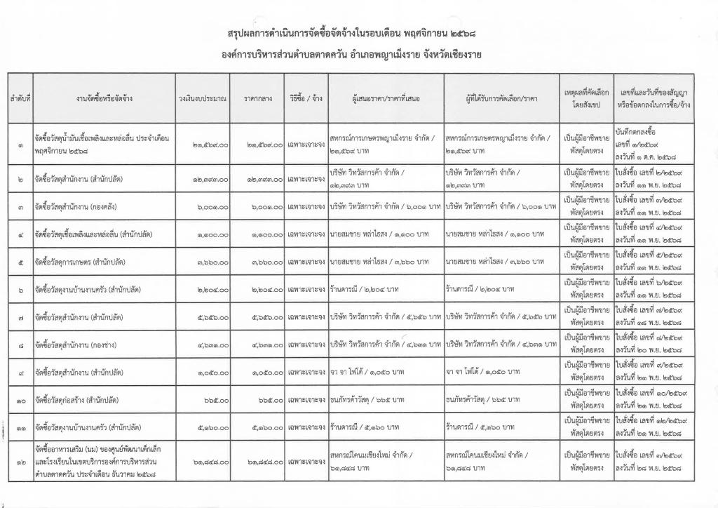 รายงานสรุปผลการดำเนินการจัดซื้อจัดจ้าง ประจำเดือน พฤศจิกายน 2568