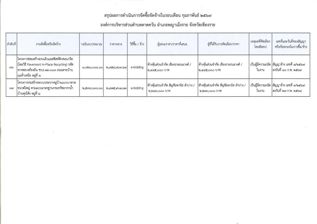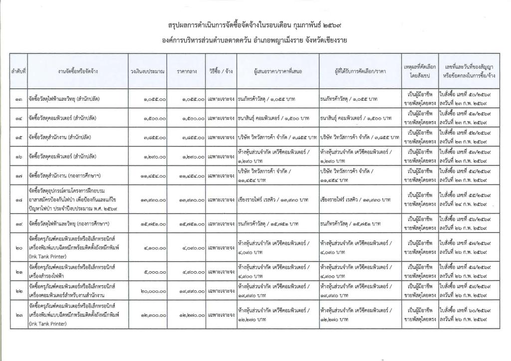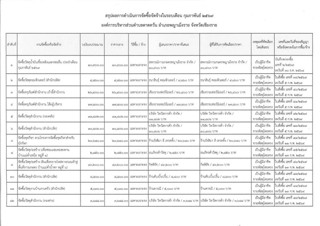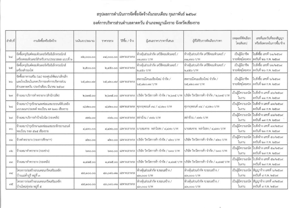 รายงานสรุปผลการดำเนินการจัดซื้อจัดจ้าง ประจำเดือน กุมภาพันธ์ 2569