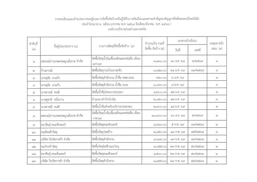 ประกาศองค์การบริหารส่วนตำบลตาดควัน เรื่อง ประกาศผลผู้ชนะการจัดซื้อจัดจ้างหรือผู้ได้รับการคัดเลือกและสาระสำคัญของสัญญาหรือข้อตกลงเป็นหนังสือประจำไตรมาสที่ 2 (เดือน มกราคม พ.ศ. 2569 ถึงเดือน มีนาคม พ.ศ. 2569