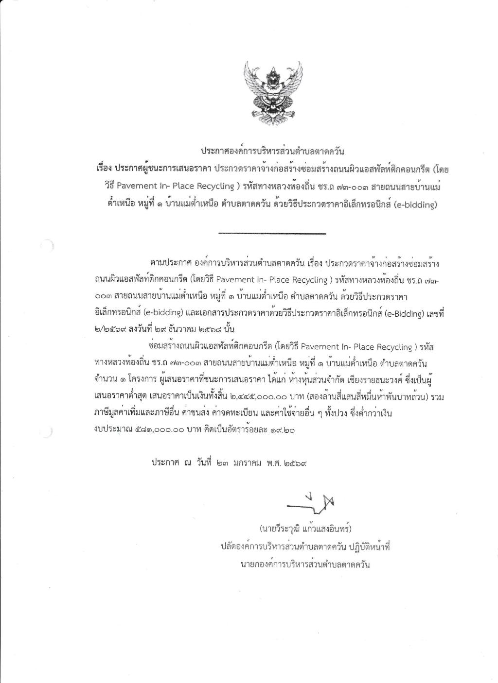 ประกาศองค์การบริหารส่วนตำบลตาดควัน เรื่อง ประกาศผู้ชนะการเสนอราคา ประกวดราคาจ้างก่อสร้างซ่อมสร้างถนนผิวแอสฟัลท์ติกคอนกรีต (โดยวิธี Pavement in - Place Recycling) รหัสทางหลวงท้องถิ่น ชร.ถ 73-003 สายถนนบ้านแม่ต๋ำเหนือ หมู่ที่ 1 บ้านแม่ต๋ำเหนือ ตำบลตาดควัน ด้วยวิธีประกวดราคาอิเล็กทรอนิกส์ (e-bidding)...