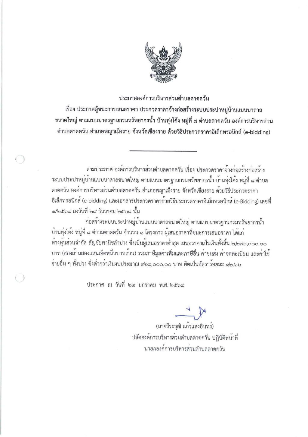 ประกาศองค์การบริหารส่วนตำบลตาดควัน เรื่อง ประกาศผู้ชนะการเสนอราคา ประกวดราคาจ้างก่อสร้างระบบประปาหมู่บ้านแบบบาดาลขนาดใหญ่ ตามแบบมาตรฐานทรัพยากรน้ำ บ้านทุ่งโค้ง หมู่ที่ 8 ตำบลตาดควัน ด้วยวิธีประกวดราคาอิเล็กทรอนิกส์ (e-bidding)...