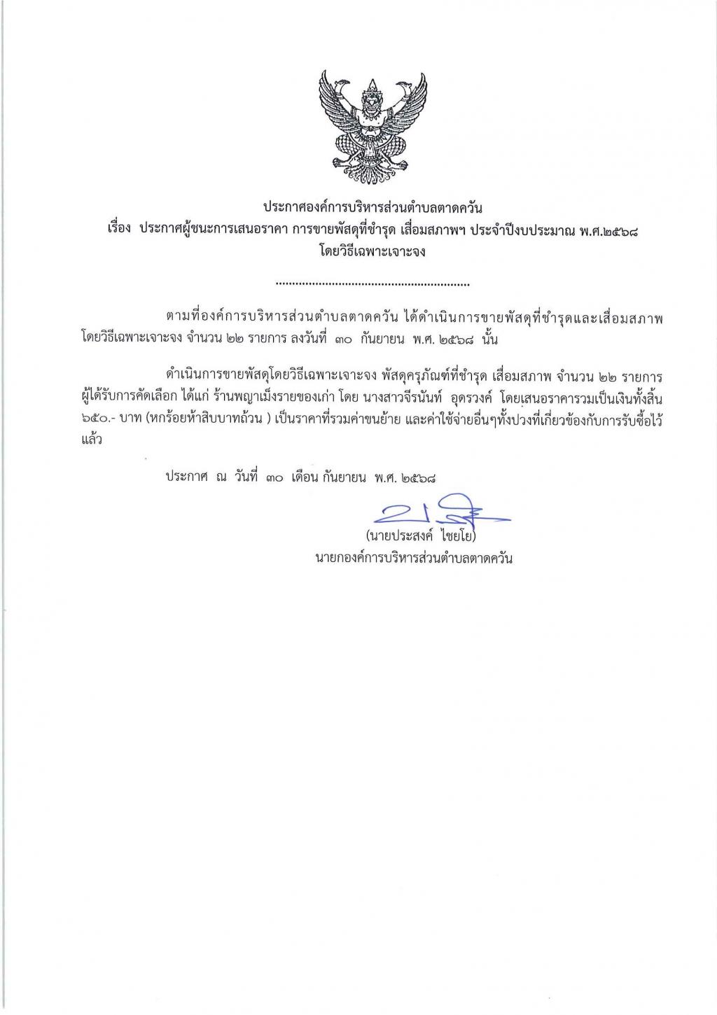 2 | (ประกาศรายชื่อผู้ชนะการเสนอราคา / ประกาศผู้ได้รับการคัดเลือก) จ้างโครงการปรับปรุงโรงอาหารศูนย์พัฒนาเด็กเล็กองค์การบริหารส่วนตำบลตาดควัน หมู่ที่ 7 โดยวิธีเฉพาะเจาะจง | คลิกอ่าน.. | 24/9/2568 |