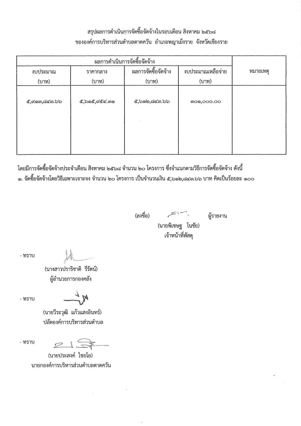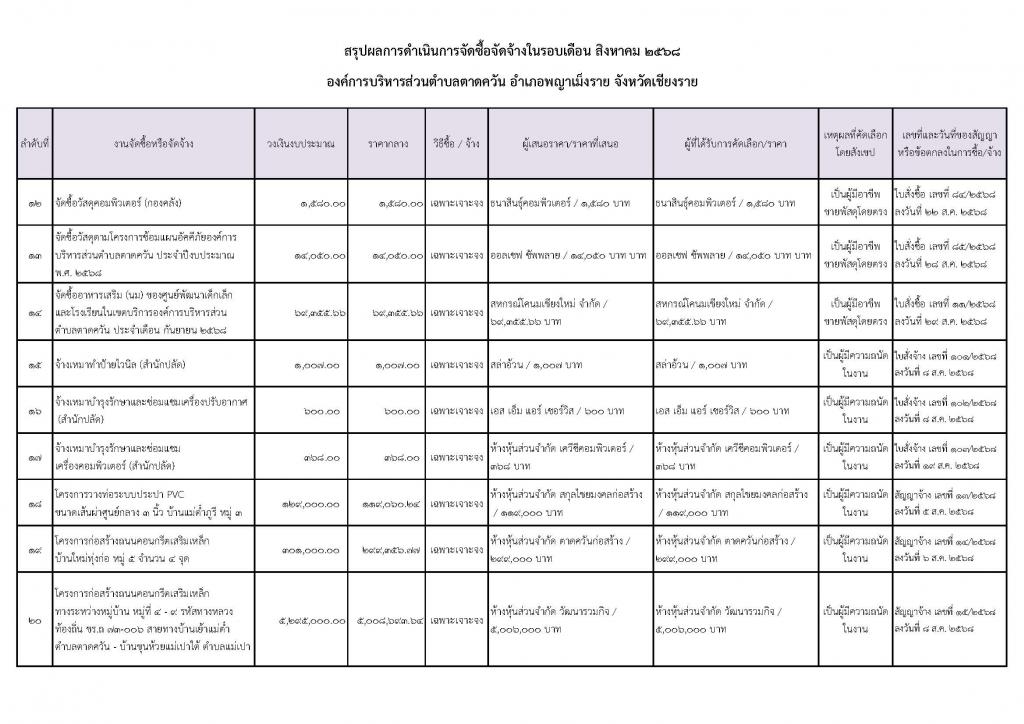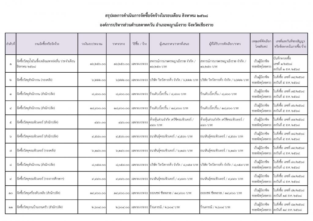 รายงานสรุปผลการดำเนินการจัดซื้อจัดจ้าง ประจำเดือน สิงหาคม พ.ศ. 2568
